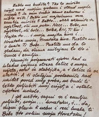 „Zašto me budite? Tko to miriše cvijet nad mojim grobom i otkud uopće cvijeće? Ja sam tražio samo zaborav i ništa više! Zašto mi najednom ova zemlja miriše? Zašto … ohhh sklonite tu svjetlost, oči me peku. Neee . Bože, ne svjetlost, oči bole … Bože, živ, Ti živ, i Majka tu … i moja majka živa i … Hrvatska moja, Hrvatska živa. Pustite me o hvala Ti Bože … Pustite me da to gledam, da očima milujem to tlo i sunce i zemlju. Nemojte prigovarati vjetru kad u hladno vrijeme otresa latice s moga cvijeta, ostat će stabljika, a i latice će se vratiti. A ti slučajni prolazniče kad naiđeš pored mog groba, ne budi ti teško poljubiti moj cvijet, a i ostale cvjetove uokolo. I još nešto, sagni se i zemlju poljubi svoju … hrvatsku, i … da, digni glavu k nebu i reci hvala ti Bože što volim svoju Hrvatsku!“