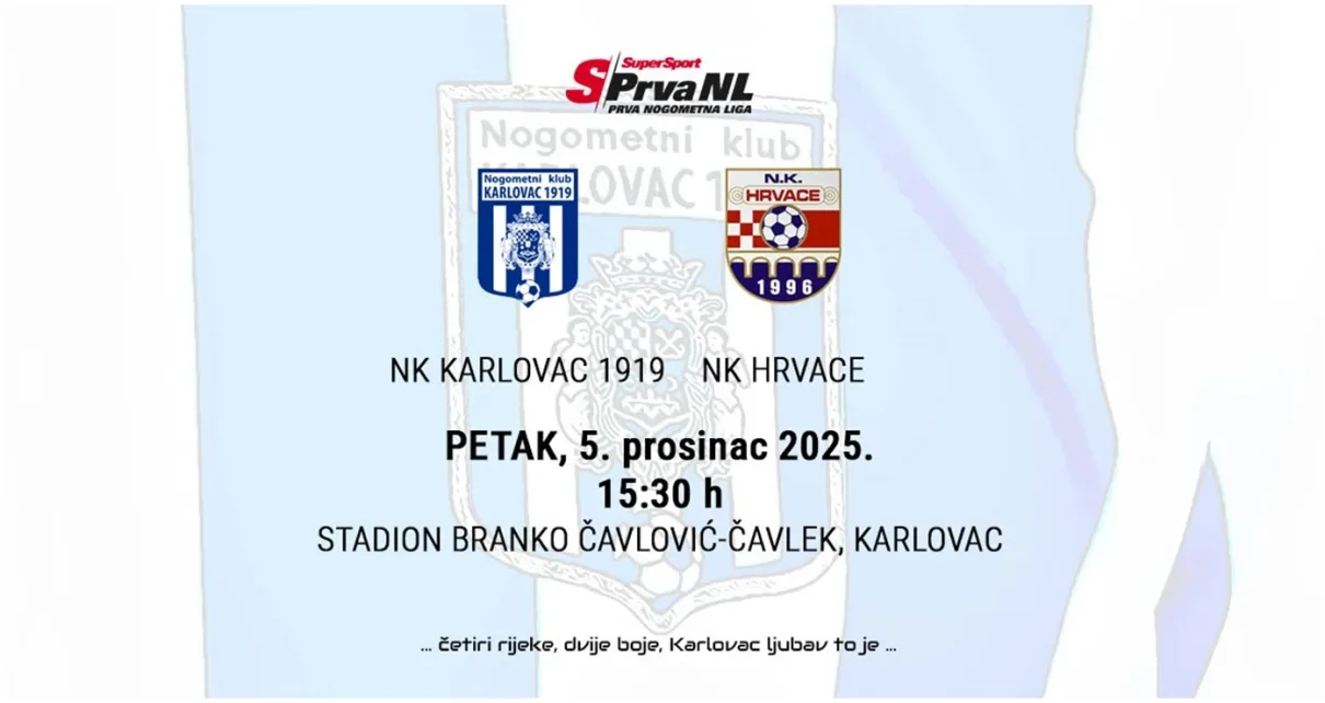 Nogometaši Karlovca 1919 u petak, 5. prosinca, na stadionu Branko Čavlović-Čavlek igraju zaostalu utakmicu 16. kola SuperSport Prve NL protiv Hrvaca. Početak je u 15.30 sati.